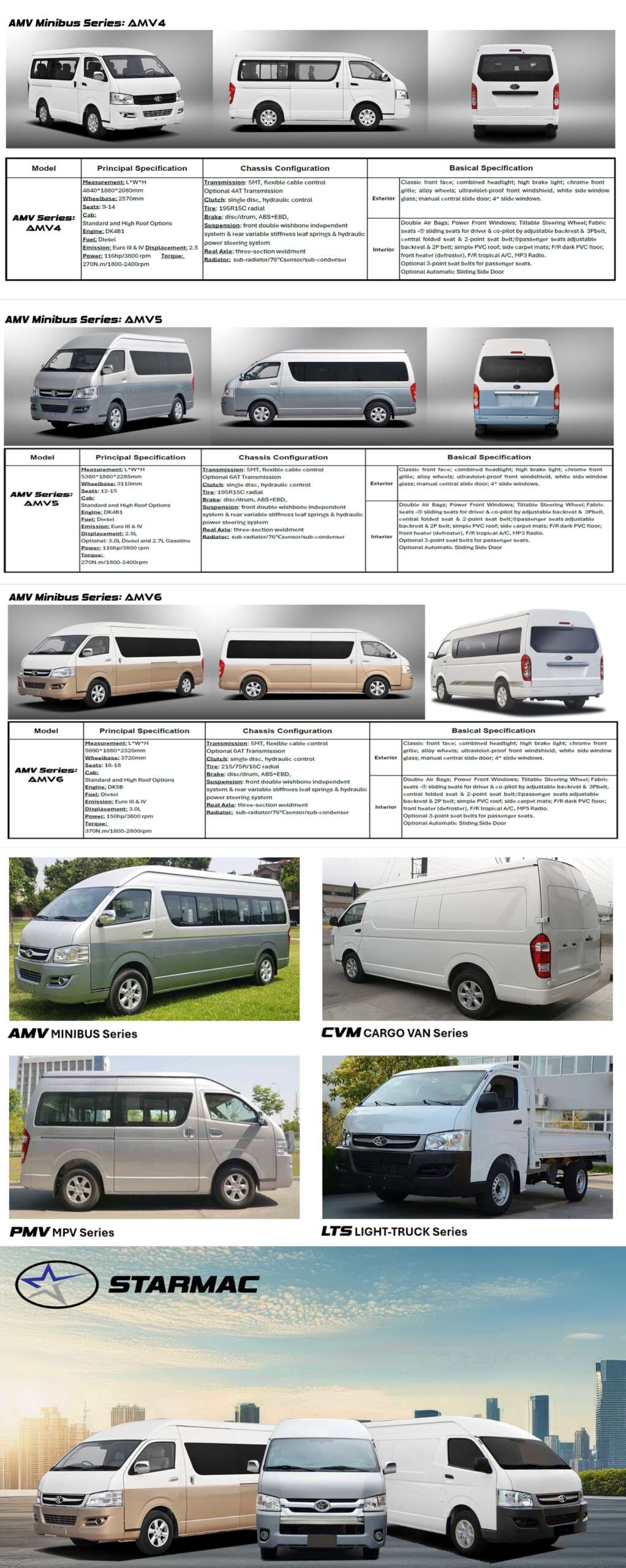 Discover the unparalleled versatility of STARMAC's impressive lineup, which includes Minibuses, Minivans, and Light Trucks. Each vehicle boasts a variety of body styles, numerous configurations, and diverse powertrain options, ensuring there's a perfect fit for you and your business. Choose STARMAC to elevate your transportation needs with unmatched customization and reliability.